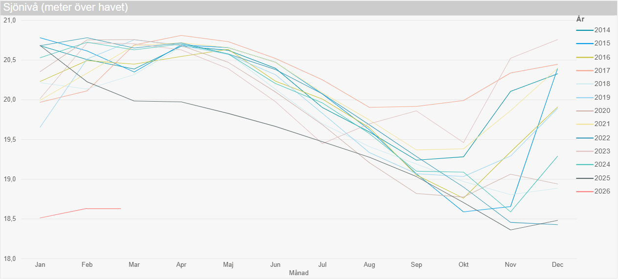 Sjönivåerna är historiskt låga för denna årstid. Under februari månad är sjömagasinet vanligtvis uppfyllt i väntan på sommarhalvårets lägre tillrinning till sjön. Dagens februarinivåer är dock de lägsta nivåer som uppmätts sedan mätningarna startade 1969. - Vad beror de låga sjönivåerna på?